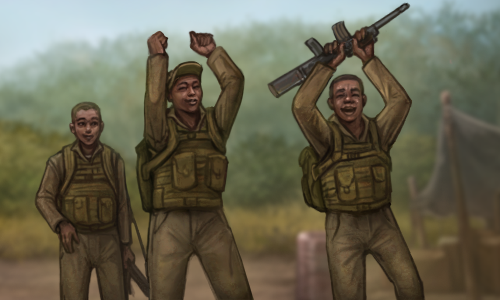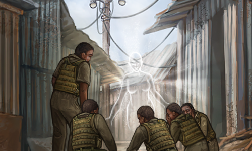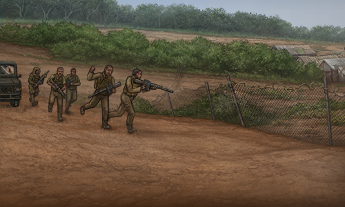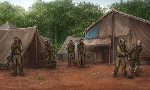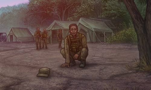 The rangers help one another carry the body of their fallen comrade to the jeeps, while others walk around the camp taking pictures, writing notes, and talking into their communication devices.