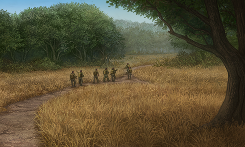 Peering out, you see a group of what you assume are rangers chattering at each other as they travel along the road. They have some sort of tree trunk on their backs, but seem harmless otherwise.